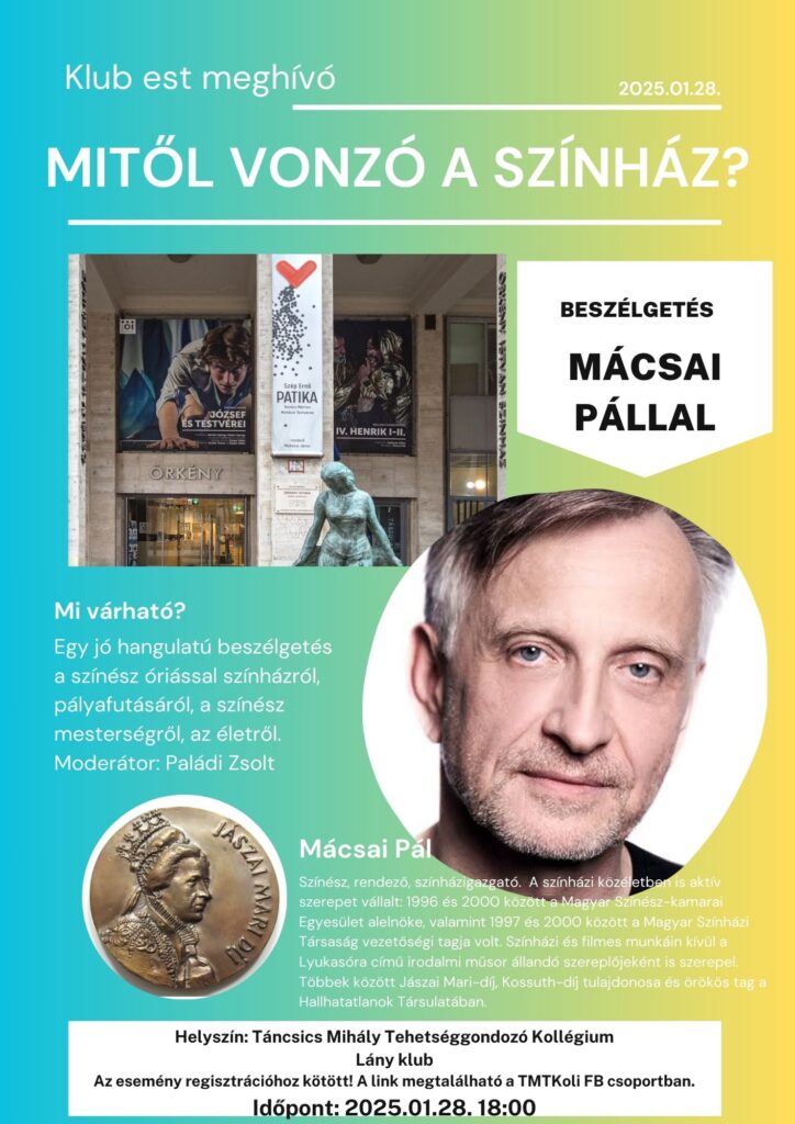 2025. január 28-án érdekfeszítő és tanulságos beszélgetésnek lehettek tanúi mindazok, akik kollégiumunkban regisztráltak a Mácsai Pállal való beszélgetésre. A magyar színházi élet egyik fő alakja és fő alakítója, az Örkény Színház igazgatója elkápráztatott minket bölcsességével, humorával és anekdotikus történeteivel. Mindannyian éreztük, nagy egyéniség látogatott el hozzánk, aki a múltat és a jelent össze tudja kötni, s ezáltal képet kaphattunk korunk színházi életéről. Emellett a színészi lét mélységeibe és nehézségeibe is bepillantást nyerhettünk, mellyel kapcsolatban sok tévhit és félreértés van. Gondolom, Mácsai Pál ezek eloszlatását is feladatának tekinti, és ez is szerepet játszhatott a meghívás elfogadásában, mindenesetre nekünk szerencsénk volt, hogy eljött. Nem sok hasonló kvalitású művész tette volna meg ezt a kedvünkért.