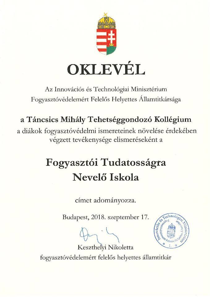 2018. szeptember 17-én a kollégiumunk elnyerte a „Fogyasztói tudatosságra nevelő iskola” címet, melyet a hagyományos év eleji közgyűlésen adtak át. Az átadón beszédet tartott Katona Péter intézményvezető és Keszthelyi Nikoletta fogyasztóvédelemért felelős helyettes államtitkár. A díjátadó részeként, kollégistáink előadásában egy zongoraművet, egy átírt darabot szintén zongorán, illetve két gitárdarabot hallgathattunk meg. A Táncsics Mihály Tehetséggondozó Kollégium volt a második az országban, amely elnyerte ezt a címet. A díjátadó után megkezdődött a hagyományos közgyűlés és bemutatták a vezetőséget, a tanári kart, illetve a diákönkormányzat vezetőségi tagjait is.