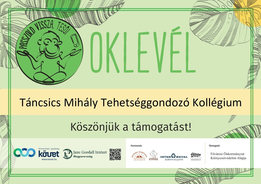 A Jane Goodall Intézet felhívásához csatlakozva a 2021/22-es tanévben is részt vettünk a használt mobiltelefon visszagyűjtő kampányban. Kollégiumunk diákjai tavaly mintegy 4 kg mennyiségű használt / törött mobiltelefont adtak le az arra kijelölt helyen. A kampányt idén is folytatjuk!