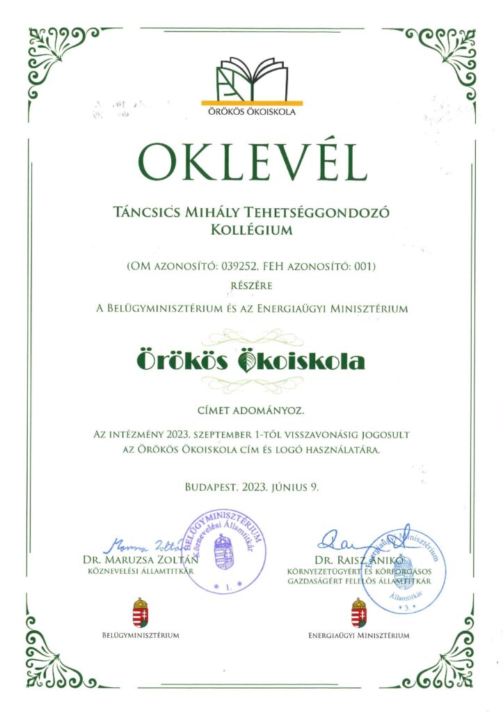 Örökös Ökoiskola 2023 By Sándor Kaczur2023. 06. 10.2026. 03. 24.Öko-kollégium Kollégiumunk rendszeres és kiemelkedő öko-kollégiumi tevékenységet folytat, ennek elismeréseként 2023-ban elnyertük az „Örökös Ökoiskola” címet.