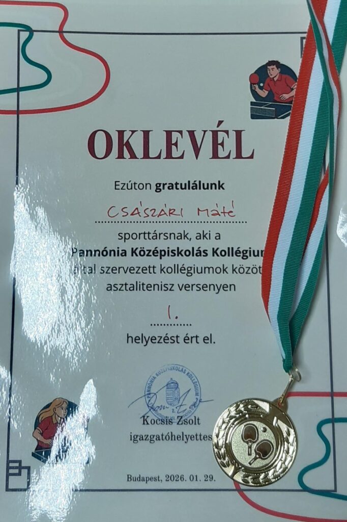 A Pannónia Középiskolás Kollégium által szervezett kollégiumok közötti asztalitenisz versenyen egyéniben Császári Máté első, Bata Márton második helyezést ért el.